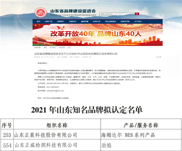 近日,山东省品牌建设促进会公布了2021年山东知名品牌拟认定名单,万搏官方在线入口科技HAMDELL/海姆达尔(BES系列产品)品牌、权属单位正威检测劲焰品牌凭借过硬的实力和强大的品牌影响力双双登榜。