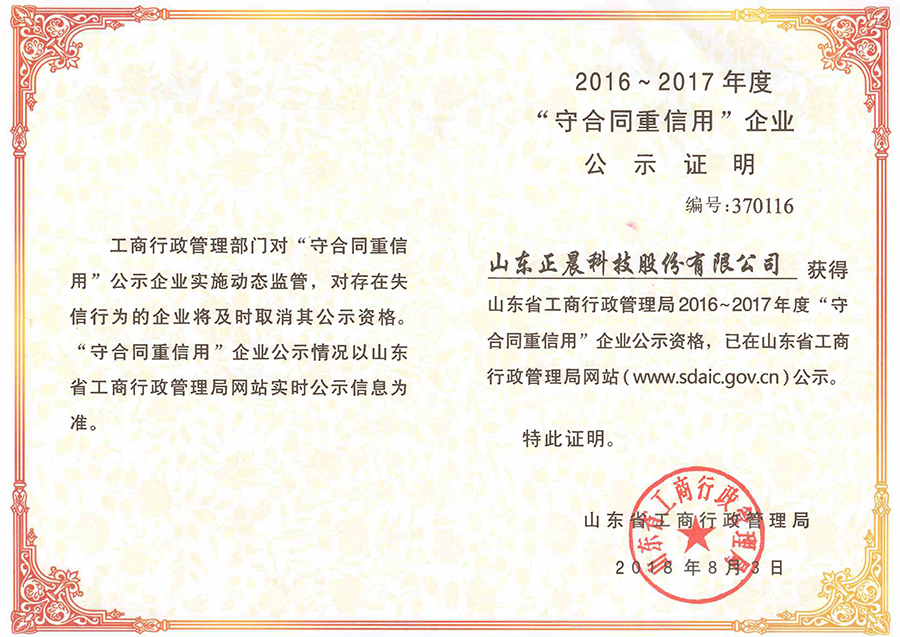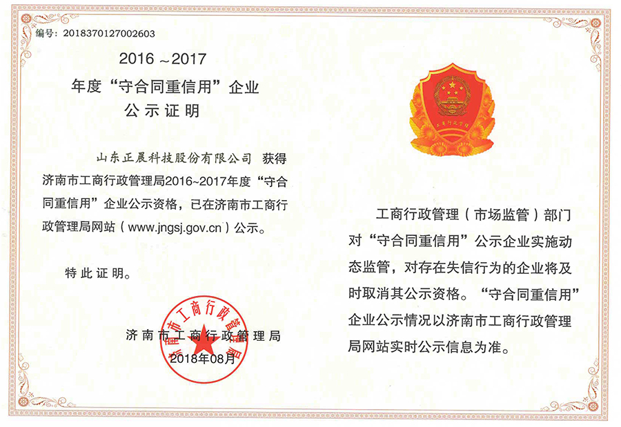 近日,山东万搏官方在线入口科技股份有限公司荣获2016-2017年度山东省工商行政管理局“守合同重信用”荣誉称号和济南市工商行政管理局“守合同重信用”荣誉称号,这也是万搏官方在线入口股份自2009年起连续十年获此殊荣。