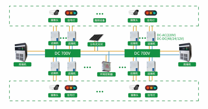 远距离供电设备作为输配侧产品,为高速公路路侧机电设备提供远距离直流供电的专业电源,为高速公路综合能源管控系统可靠运行奠定了基础。采用恒压、恒流、恒功率模式,直流传输,减少逆变,降低线损和变损。通过环网控制技术实现相邻供电单元电力互通,保障供电的稳定性和可靠性。