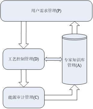 将能耗需求指标作为动力机制,指导和管理相关机电设备的产能,使其稳定地处于高转换效率的最佳运行工况,实现供需平衡,做到杜绝浪费、挖掘潜力、和高效运行,改变现有技术及产品的传统的控制模式;同时,利于数据挖掘技术和工作流引擎技术,以专家知识库为支撑,实现符合PDCA戴明环的持续改进机制,充分使用大量的有价值的工况数据,实现模糊控制,不再采用通过固化调控程序进行工艺管理的方式,这样可以降低对设计人员、调试人员和维护人员的技术要求。基于PDCA持续改进进制,将智能监控平台划分为四个工作界面,分别为用户需求管理(P)、工艺控制管理(D)、能源审计管理(C)和专家知识库管理(A)。